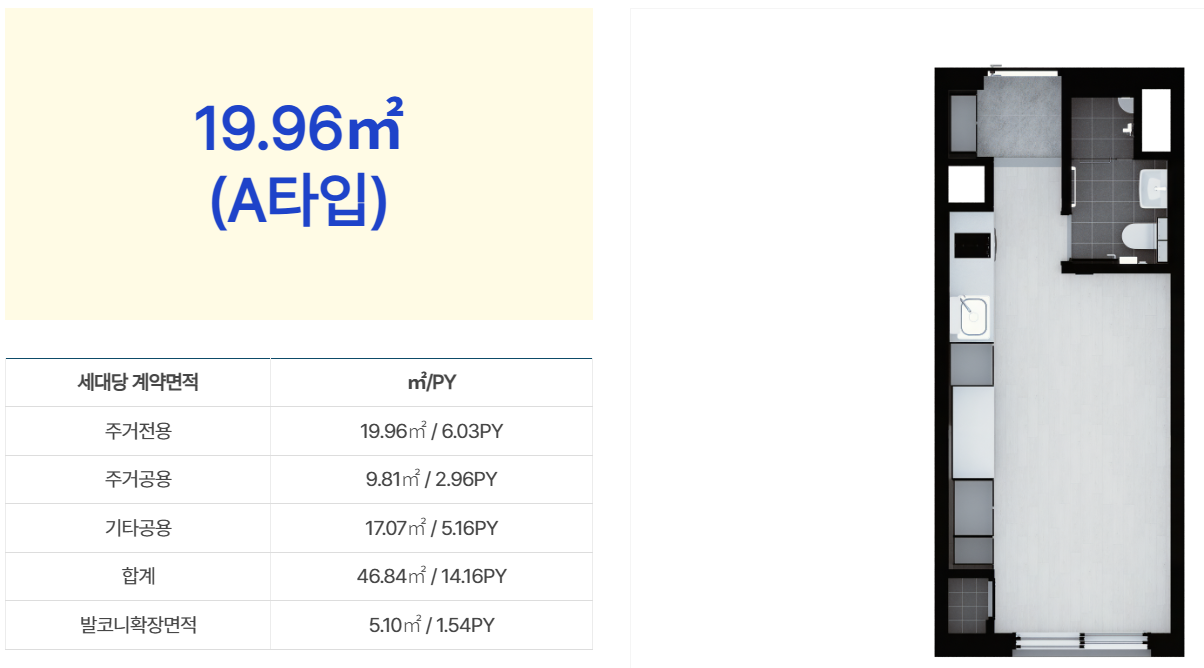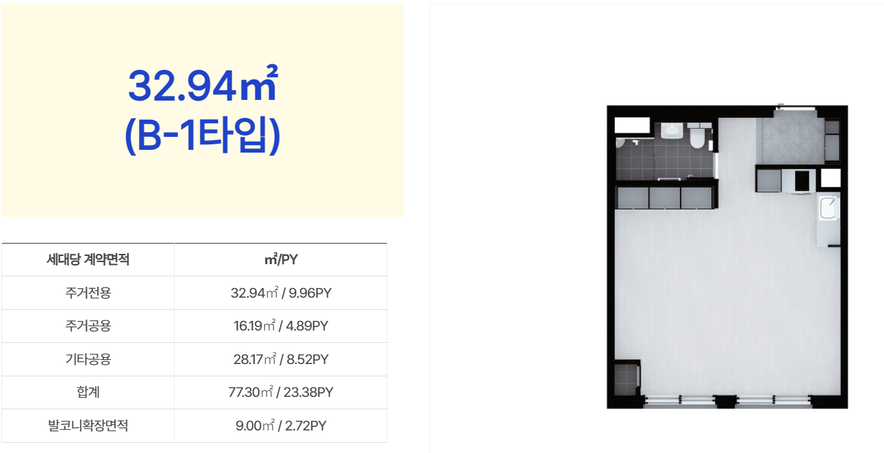 • 19.96㎡, 22.16㎡, 32.94㎡ 등 (원룸형 중심)