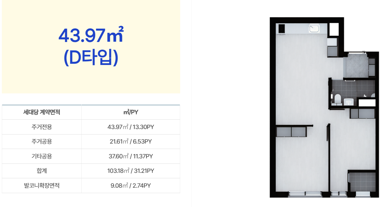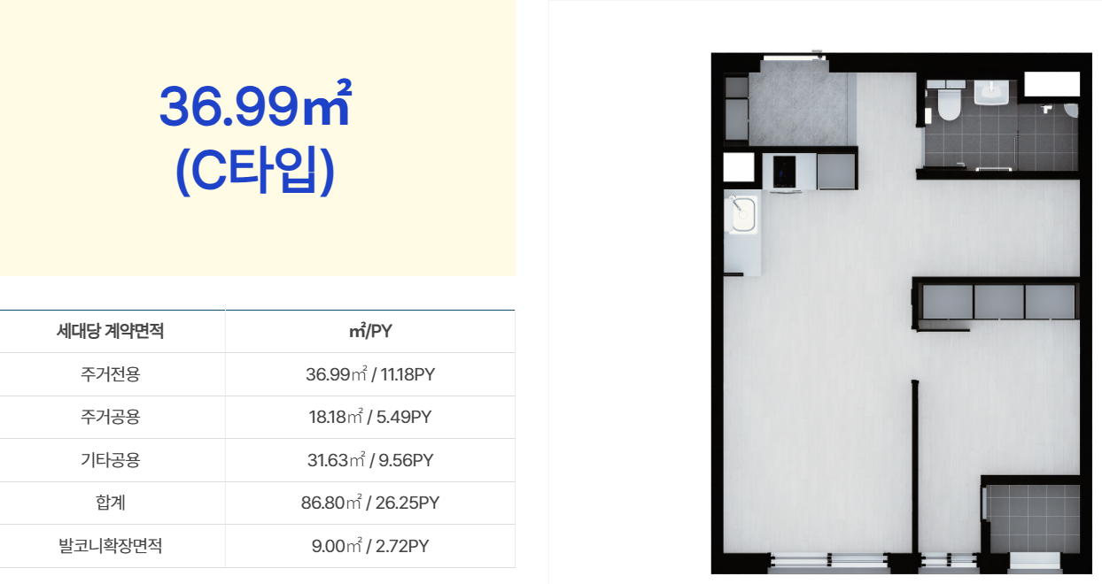 • 36.99㎡, 41.02㎡, 43.97㎡, 48.00㎡ 등 (방2개 이상 선택지)