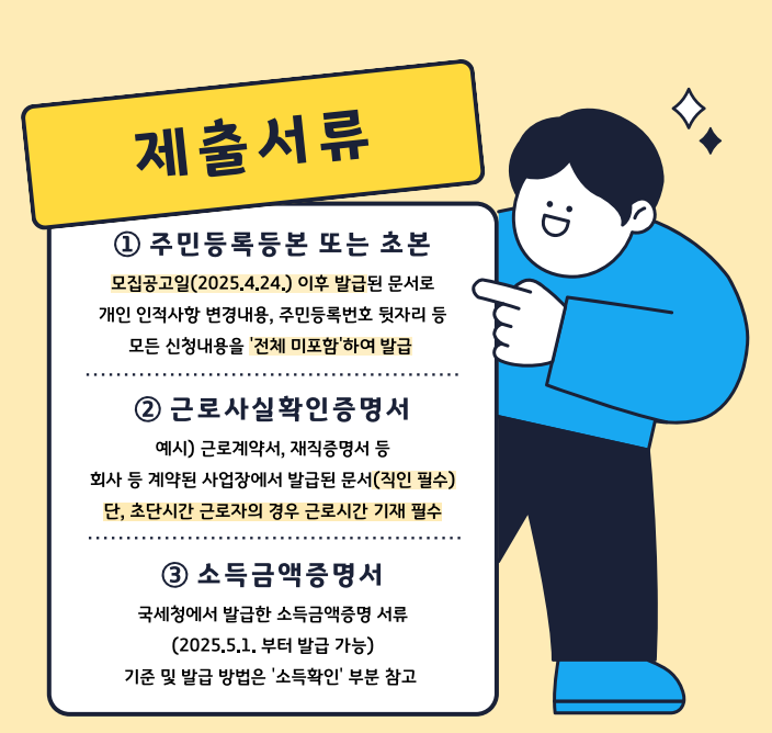 | 2 | 재직증명서: 계약기간 및 근로시간 명시 | *공고일(2025.4.24.) 이후 발급된 서류 |