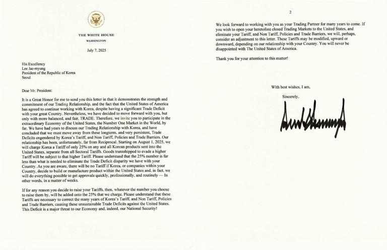 2025년 7월 7일, 미국 트럼프 전 대통령은 한국과 일본 정부에 동일한 내용의 관세 통보 서한을 발송했습니다.