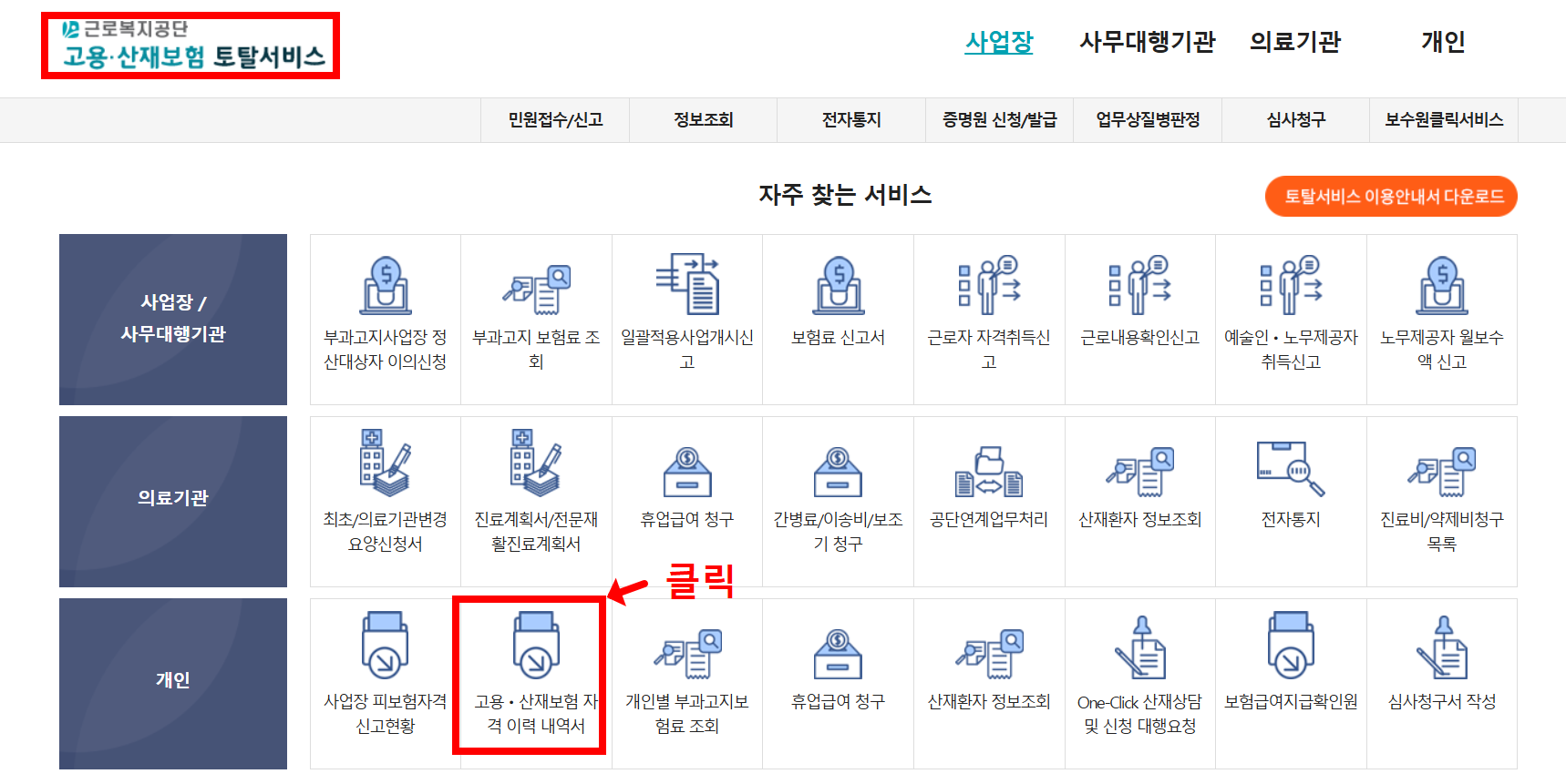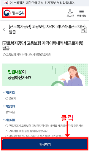 - 검색창에 고용보험 자격이력내역서 입력