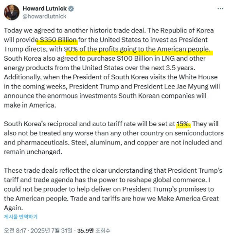 한국은 미국에 3,500억 달러를 투자하기로 약속했습니다. 일본(5,500억 달러), EU(6,500억 달러)보다 절대액은 적지만, GDP 대비 20%로 비율은 가장 높습니다.
