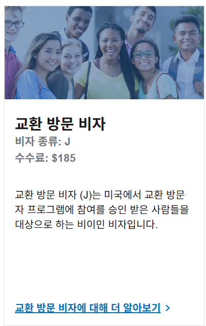 외국인이 연수, 인턴십, 교환학생, 교육, 연구 등의 목적으로 미국에 체류할 수 있도록 허가하는 비자입니다.