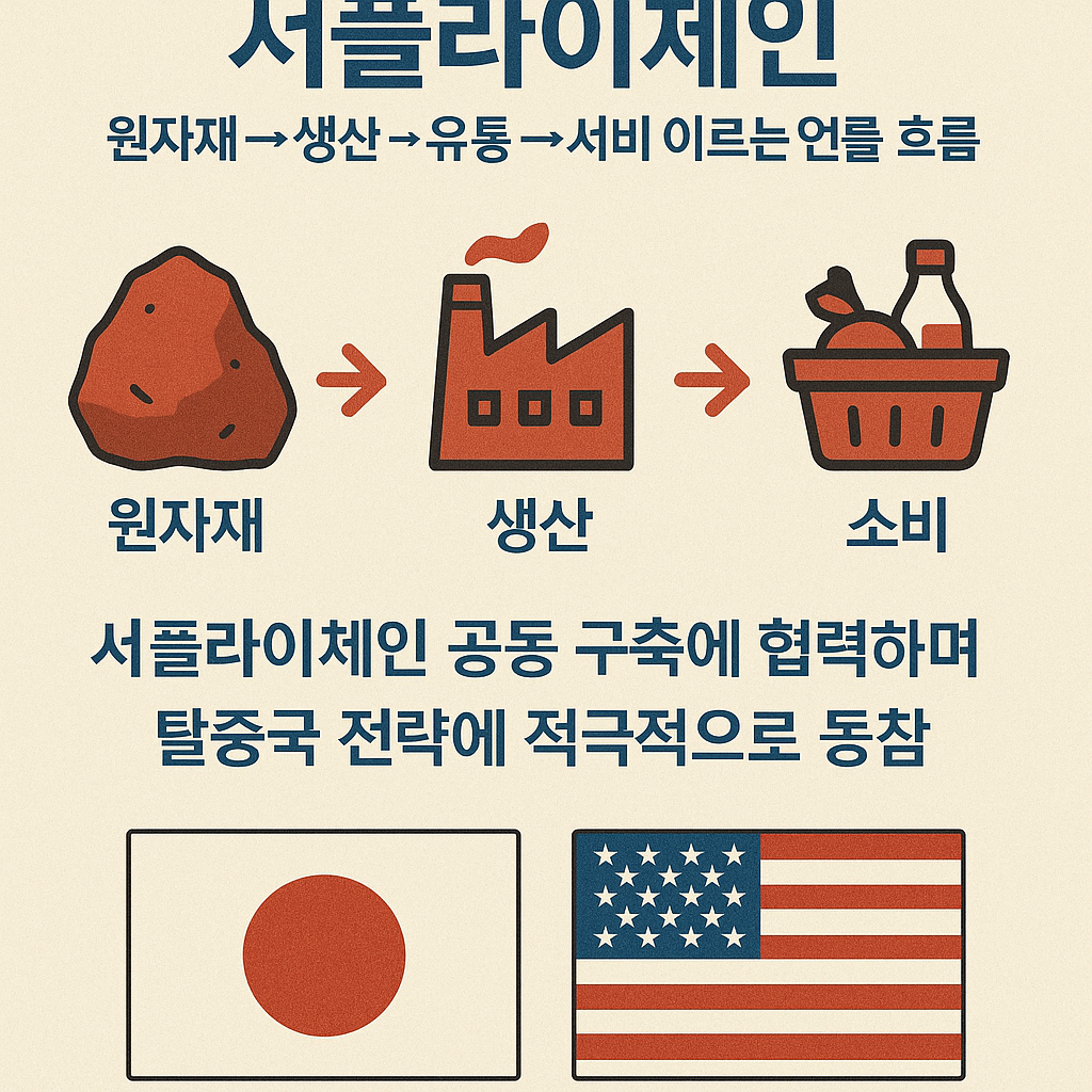 서플라이체인(supply chain)은 원자재 → 생산 → 유통 → 소비에 이르는 산업 흐름 전체를 뜻합니다. 일본은 미국과의 공동 공급망 구축에 협력하며, 탈중국 전략에 적극적으로 동참하고 있음을 시사했습니다.