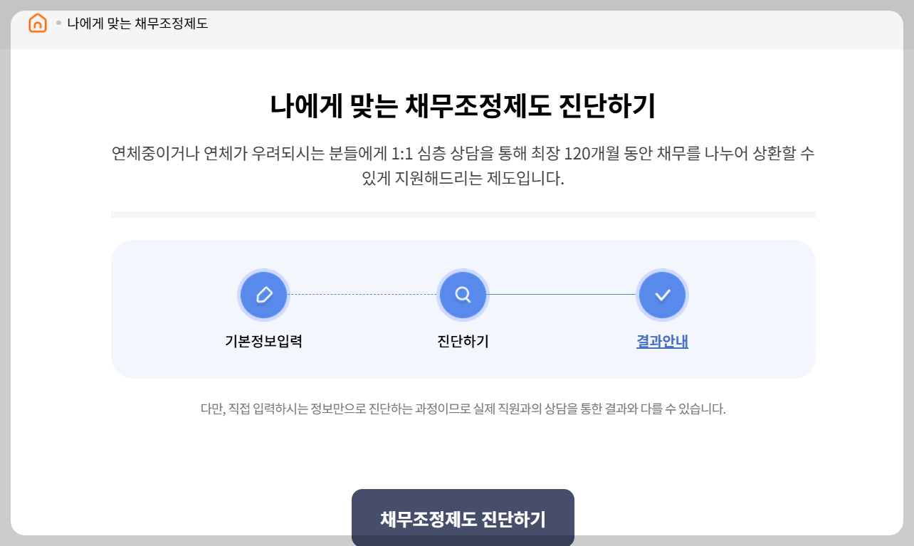 - 상단 메뉴 → “채무조정제도 진단하기” 클릭