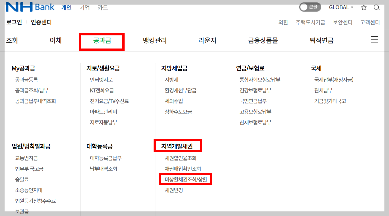 - 농협: NH스마트뱅킹 → 공과금 → 지역개발채권 → 미환급 조회