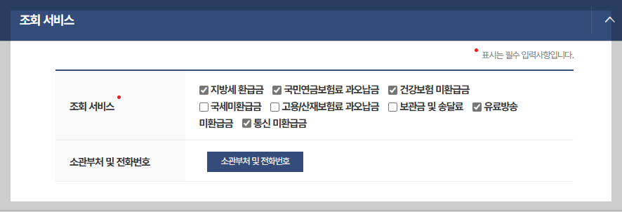 조회되는 건 지방세·건보·통신비 환급금 등입니다.