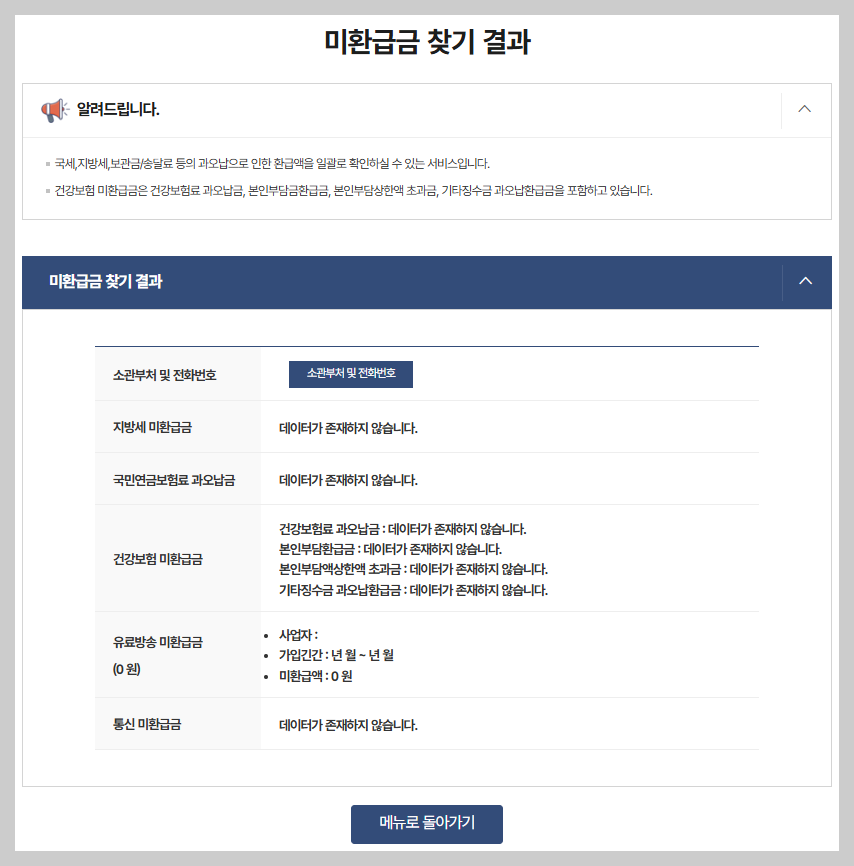 이는 현재 본인 명의로 조회 가능한 미환급금이 없다는 뜻입니다.