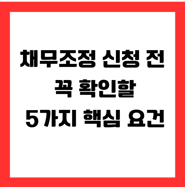 “채무조정 신청 전 이 5가지 요건만 꼼꼼히 챙겨도 `불필요한 거절과 시간 낭비를 크게 줄일 수 있습니다.` 미리 준비하고, 순조로운 진행으로 재기의 첫걸음을 준비하세요!