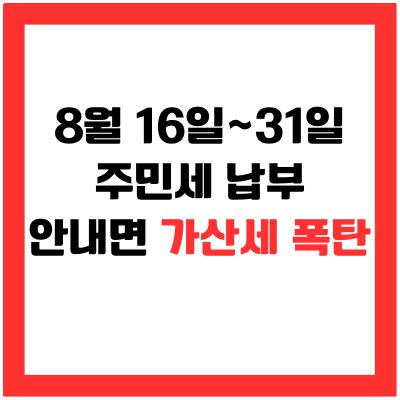 2025년 주민세 납부기간은 8월 16일부터 31일까지! 납부대상, 위택스 납부방법, 가산세율, 기한 내 납부 팁까지 한눈에 정리했습니다. 기한을 넘기면 가산세(세액의 3%)와 중가산금까지 늘어날 수 있으니, 지금 바로 확인하고 납부하세요!