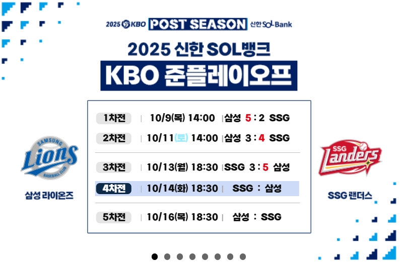 | 준플레이오프 | 10월 초 ~ 중순 | 5전 3선승 | 3위 팀 홈 / 상대 구장 이동 방식 | 오후 6:30 기준 |